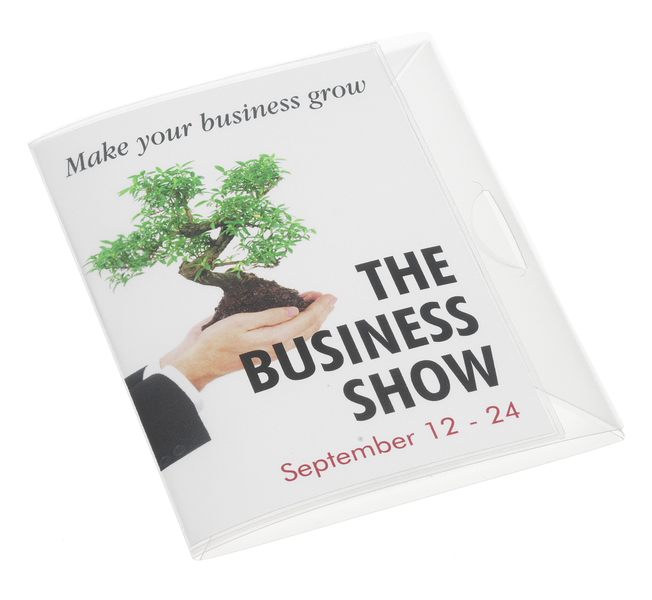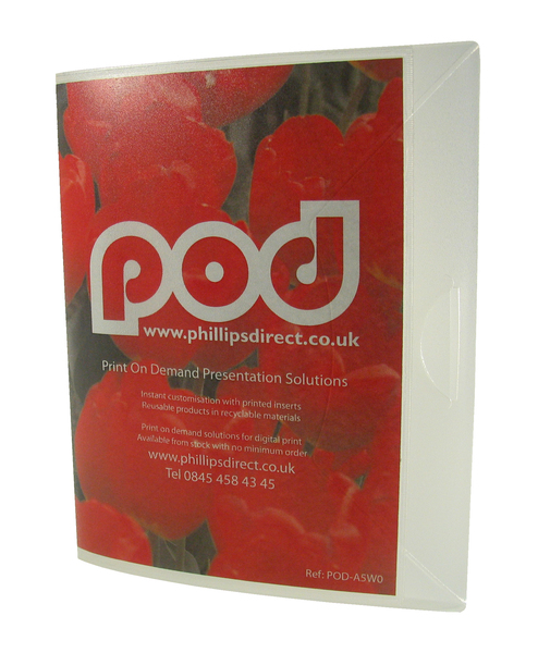 For a professional custom folder solution. Insert your own print or order online with printed inserts supplied from your artwork. 'Print-On-Demand' A5or A4 plastic file / document folder with an A5 or A4 display pocket to inside front cover for quick and easy customisation. This document folder is ideal for low capacity presentations for a wide range of needs, such as home seller information packs, branded conference or event folders, school and university coursework, health and safety, training documents, policies and procedures handbooks and other personalised promotional requirements. This is a flat folder and can hold up to 50 sheets (approx) of standard paper.